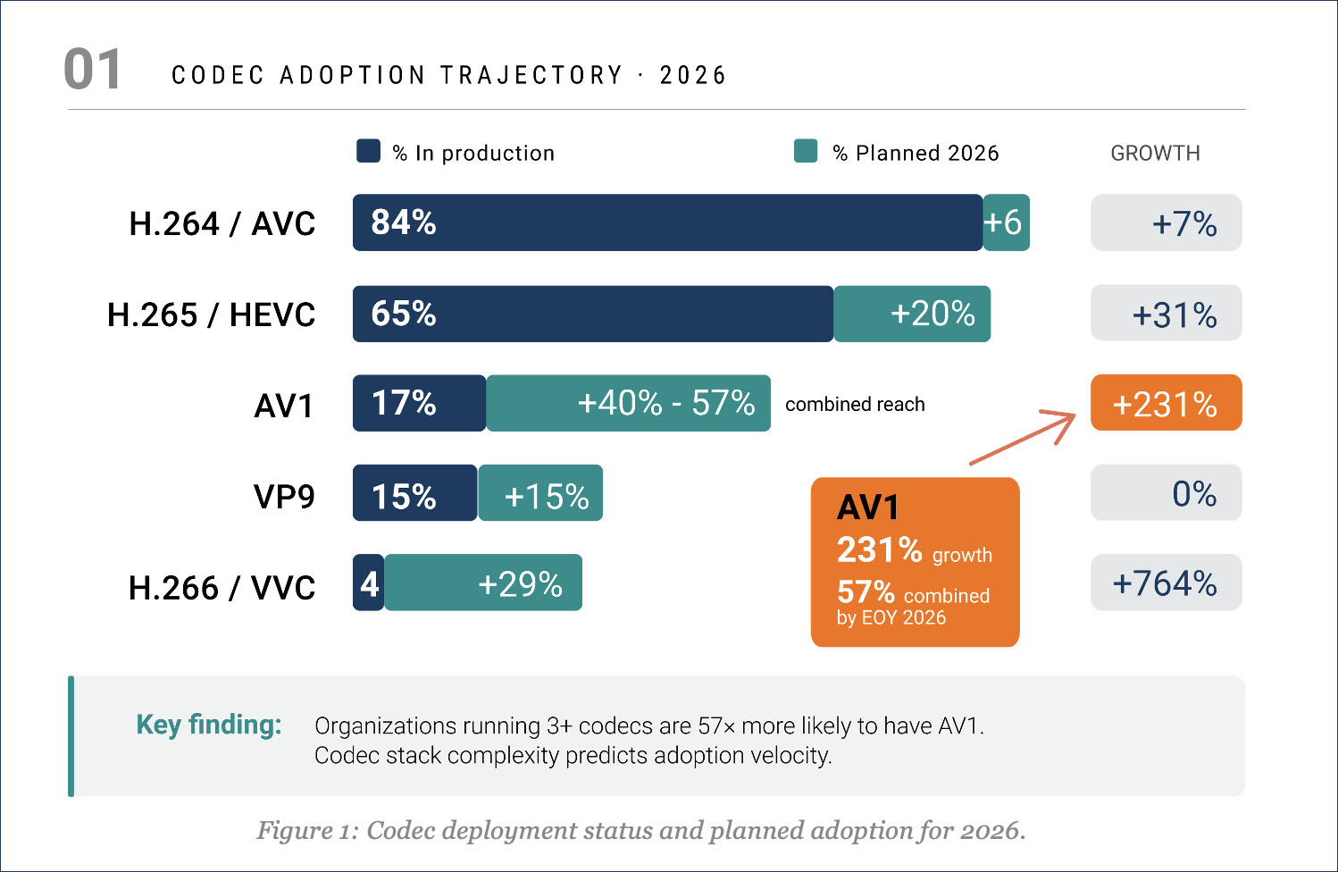 One additional data point I found interesting: organizations running three or more codecs in production today are 57 times more likely to have AV1 in their stack compared to single-codec operators. Current codec stack complexity is the strongest predictor of future adoption velocity. That pattern makes intuitive sense. Teams with multi-codec experience already have the tooling, testing workflows, and operational maturity to add another format without starting from scratch.