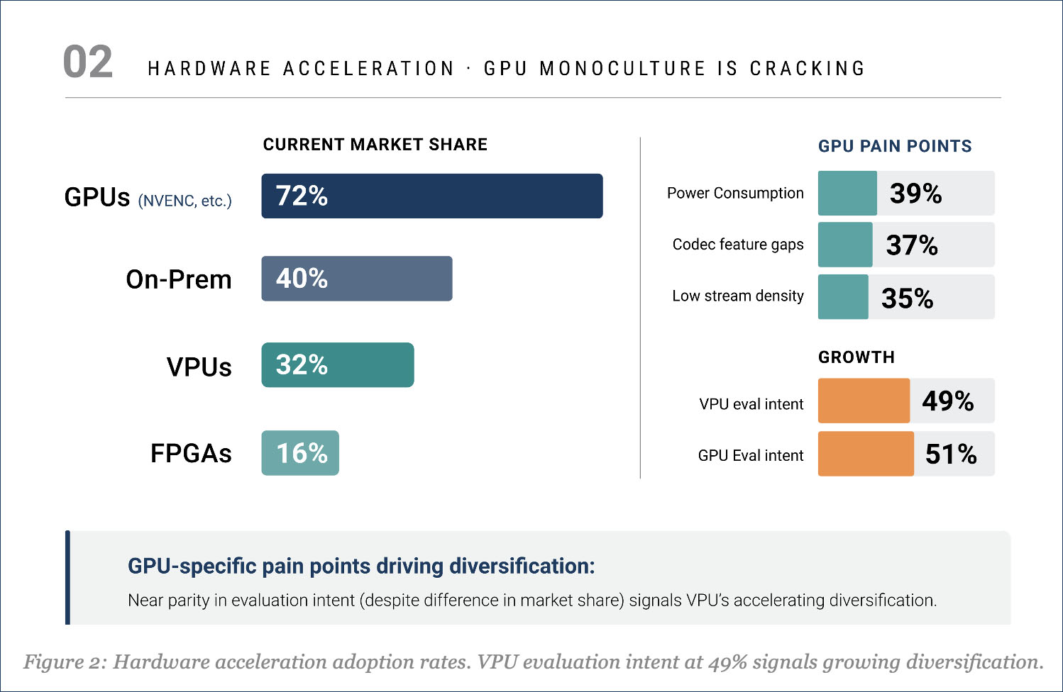 GPU-specific pain points explain the hardware diversification. Power consumption leads at 39%, followed by codec/feature gaps at 37% and insufficient stream density at 35%. For live and high-density workloads, these are meaningful operational constraints. The report notes that VPU evaluation intent stands at 49%, nearly matching the 51% who plan to evaluate GPUs. Live and broadcast operators are 2.2 times more likely to adopt VPUs, driven by density economics and latency requirements that GPUs can struggle to meet at scale.