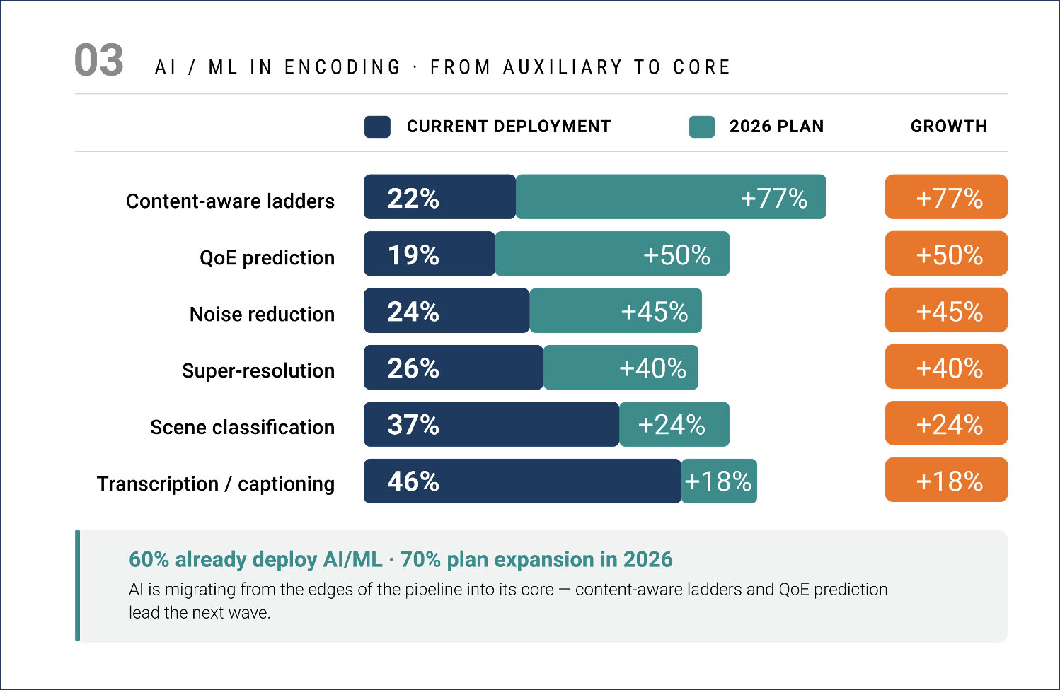 60% of respondents currently deploy AI/ML in at least one encoding workflow, and 70% plan to expand those capabilities in 2026. That is no longer experimental. The more interesting story is where AI is heading versus where it started. Current deployments concentrate on what I would call adjacent applications: transcription and captioning at 46%, scene classification at 37%, and super-resolution at 26%. These sit next to the encoding pipeline but do not fundamentally change how encoding decisions are made. The highest-growth applications tell a different story. Content-aware ladder generation shows the highest planned growth at 77%, followed by QoE prediction at 50%. These are core encoding intelligence functions—they sit inside the pipeline and directly influence bitrate allocation, resolution selection, and quality optimization.