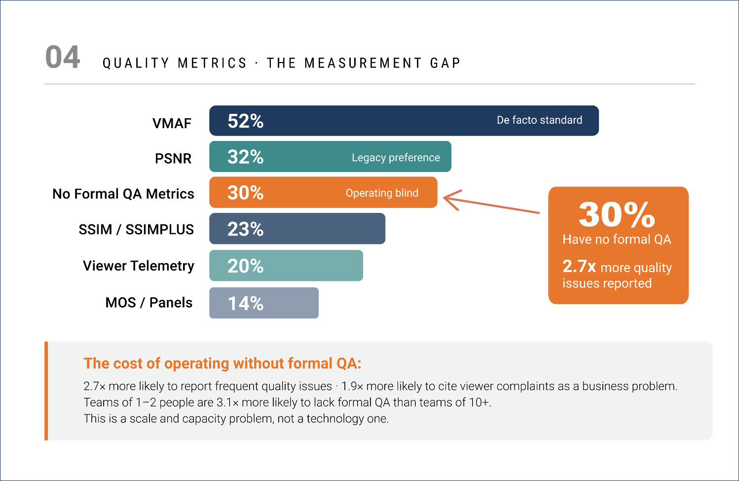VMAF has crossed the 50% adoption threshold at 52%, establishing itself as the de facto objective quality metric for the encoding industry. PSNR remains at 32%, mostly due to legacy pipeline inertia rather than active preference. But here is the number I found interesting: 30% of respondents operate without any formal QA metrics.