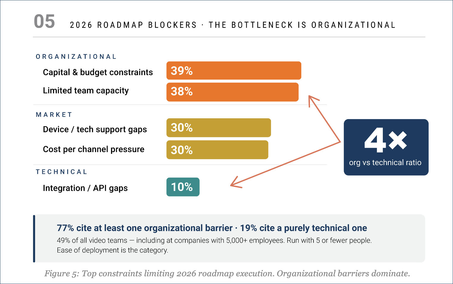 In other words, 77% of respondents cite at least one organizational barrier, compared to just 19% citing a purely technical one. This shows the bottleneck is not the technology. It is the budget to buy it and the team capacity to implement it. This matters because the data elsewhere in the report shows that 49% of all respondents have video engineering teams of 1 to 5 people. Even among companies with 5,000+ employees, small video teams are not uncommon. When the report says lean teams are the norm across all company size brackets, it has real implications for how vendors should think about integration complexity, time to value, and operational overhead.